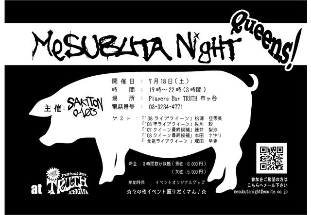 帰ってきちゃいました☆メス豚night!! 今回も豪華なゲストにちょっぴり心トキメいちゃう夜をお届けしちゃいます☆ ってな事で詳細決まりました! 今回のメス豚チャンはクィーン祭りです! 日程:7月18日(土) 時間:19:00〜22:00(3時間) 場所:プレイヤーズBARtruth市ヶ谷 プラン:3時間飲み放題 (男性:6千円) (女性:5千円) 尚、今回はちょい飲みプランは紛らわしくなってしまうので無くさせて頂きました。 ご了承ください。 そして今回の気になるゲストが決定いたしました! 今回のゲスト達は