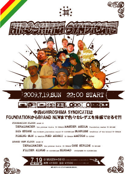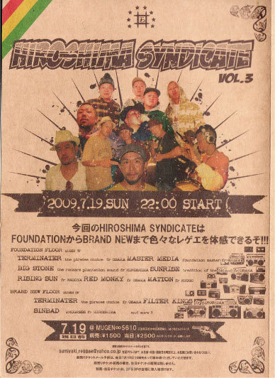 HIROSHIMA SYNDICATE vol.3 2009.7.19.SUN¡Ê½ËÆüÁ°¡Ë @MUGEN¡ç5610¹Å縩¹Åç»ÔÃæ¶èÌô¸¦ËÙ1-3¤¢¤º¤Þ¥Ó¥ë£²£Æ¡õ£³£Æ OPEN:22:00 FOUNDATION FLOOR¡¡mugen¡ç5610 3F ¡ÚSOUND¡Û ¡¦ TERMINATER the pirates choice fr osaka ¡¦ MASTER MEDIA foundation master fr ehime ¡¦ BIG STONE the rockers plantation sound fr hiroshima ¡¦ BIG BOSS GWAAN jammassive fr hiroshima ¡¦ SUNRISE fr osaka ¡¦ RISING SUN fr nagoya ¡ÚDee-Jay¡Û ¡¦ MATTON ¡¦ RED MONKY BRAND NEW FLOOR mugen¡ç5610 2F ¡¦ TER