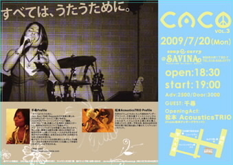 Caco vol.3 2009/7/20(Mon) @SAVINA open 18:30 start 19:00 Adv:2500 Door:3000 Opening act: 松本 Acoustic TRIO GUEST:千尋 今回はcacoの地元アーティストの松本アンダーグラウンド率いるアコースティックトリオが出演してくれる事になりました! Profile 世界のどうしようもない大人代表松本アンダーグラウンド、万物を癒やすインストロメンタルアーティストキタカゼロック、お墓のご用命はこちらまで。リズムと石を正確に刻む職人石屋コウスケ。世界一平和な町、秋田は由利本荘市の片隅で毎日毎日遊んで暮らすノン