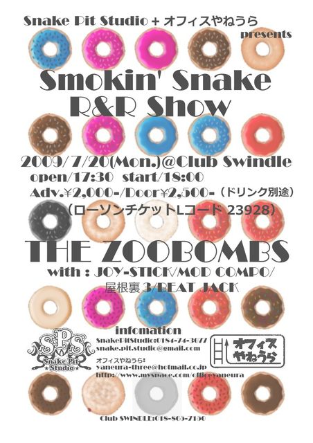 SNAKE PIT STUDIO & オフィスやねうら PRESENTS 7月20日(月) @秋田CLUB SWINDLE OPEN 17:30 START 18:00 TICKET ADV/2,000円 DOOR/2,500円(DRINK別) (LIVE) ☆THE ZOOBOMBS ☆MOD COMPO ☆JOY STICK ☆BEAT JACK ☆屋根裏3 & more… (DJ) ☆WATCH(オフィスやねうら) ☆秋田スリム THE ZOOBOMBSのドラムは地元(由利本荘市)で長年CD・レコードショップを経営しているPITINNの息子です。 さ〜〜地元に錦を飾れるか??? チケットはSNAKE PIT STUDIO・GYPSY WAGONで取り扱っております。