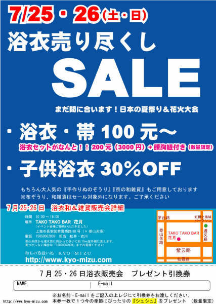 7月25・26日(土・日) 皆様お待ちかねの 2009年浴衣売りつくしSALEを上海虹橋で行います 夏休み日本に帰って花火大会に行かれる方 上海の夏イベントに浴衣で参加したい方 今年の夏は浴衣を絶対着たい方 毎年すくすく成長するお子様の浴衣のサイズでお悩みの方 せっかくの夏だし友達と浴衣でも着て食事をしたい方 中国からのお土産で友達や家族を驚かせたい方 そんな皆様に朗報です SALE? 『浴衣・帯100元〜』 浴衣セットがなんと!!20