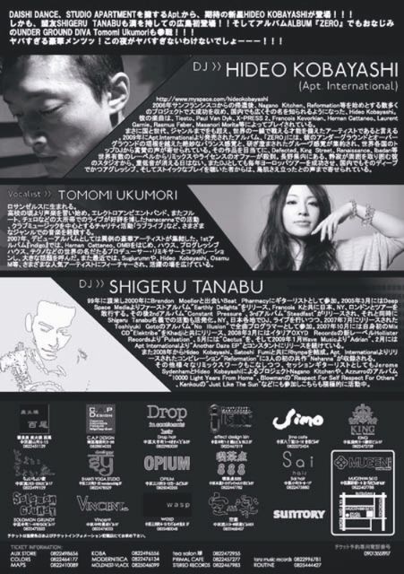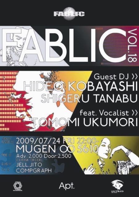 FABLIC vol.18 Guest DJ HIDEO KOBAYASHI SHIGERU TANABU Feat. Tomomi Ukumori 2009/07/24 FRI 22:00- at MUGEN ∞ 5610 広島市中区薬研堀1-3あづまビル2F&3F tel:(082)240-7788 e-mail:info@mugen5610.com http://mugen5610.com/ Adv.:\2,000/Door:\2,500(one drink order) support DJ:JELL,JITO VJ:COMPGRAPH DAISHI DANCE、STUDIO APARTMENTを擁するApt.から、TOKYO UNDER GROUND期待の新星HIDEO KOBAYASHIの登場です!!! しかも、盟友SHIGERU TANABUも満を持しての広島初登場!!そして両名とSATOSHI FUMIのユニットRHYN