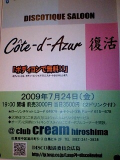 《DISCO復活委員会広島》 ◆ 前払いチケット(Adv) 3000円(税込 2ドリンク付フリーフード) ◆ 当日チケット(Day) 3500円(税込 2ドリンク付フリーフード) ☆★☆★☆★☆★☆★☆★ mixi《DISCO復活委員会広島》が企画お届けする 80年台の 広島ディスコシーンの再現です!! ◆◇◆◇ Disco【Cote-d'-Azur】(コートダジュール)復活 ◆◇◆◇ 当時のディスコシーンを忠実に再現いたします。 ☆★☆★☆★☆★☆★☆★ ☆特典☆ ◆ 20時までにご来店の方には、+ドリンク1杯無料サービスしちゃいます〜♪ ◆ オープンと同時に バイ