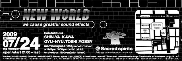 毎月第四金曜日に開催されているテクノ系パーティーNWDです。 良い感じに盛り上がってます。 メンバーパスをお持ちの方は必ず入り口で店員に提示して下さい。 お問い合わせお気軽にお待ちしてます。 【NEW WORLD】 we couse greatful sounding effects! ----------------------- Sound tipe : Techno,House Detail : Techno,Tech House,Deep House,Click,Minimal, Acid House,Electro,Chicago House NEW WORLD DJs : SHIN-YA/KAWA/GYUNYU/Yossy Vj : SHINBUN ----------------------- 2009.7/24(fri) the every 4th fr