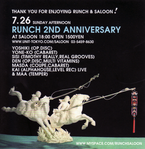 Party info : http://www.unit-tokyo.com/saloon/schedule/2009/07/726_runch_2nd_anniversary.php