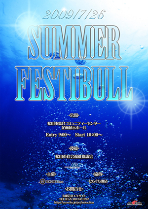 Summer festibull2009 日時:2009年7月26日(日) ※前日7/25(土)は同会場にて『PERFECT第7戦』開催。 会場:松山市総合コミュニティーセンター 企画展ホール 愛媛県松山市湊町7-5 089-921-8222 FEE:1day \5,000(昼食付) ゲーム料金 301:\100 501:\200 701:\200 Sクリケット:\200(15R) 主催・お問合せ先 有限会社エキサイト TEL 089-947-3767 後援 松山市社会福祉協議会 株式会社HIC/DartsJapan運営本部 協賛 むらぐち酒店 ※25日(土)2009 PERFECT 第7戦 愛媛 出場希望の方はPE
