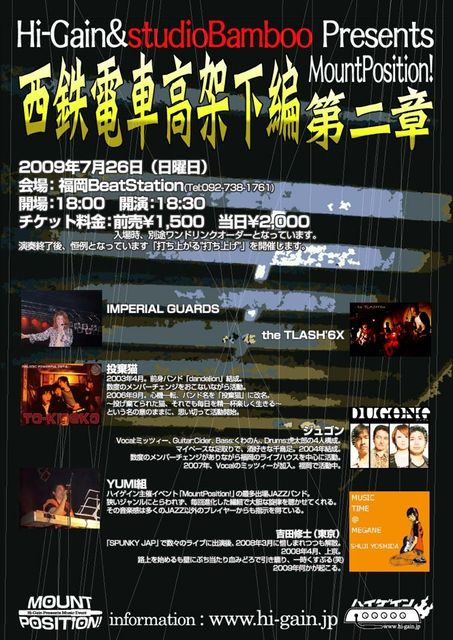 2009/7/26(日) 「Hi-Gain & Studio Bamboo Presents MOUNT POSITION 西鉄電車高架下編 第二章」 会場 福岡BEAT STATION 開場18:00 開演18:30 前売¥1,500 当日¥2,000 cast) IMPERIAL GUARDS the TRASH'6X 投棄猫 ジュゴン Yumi組/ 吉田修士 ※画像は制作途中です。