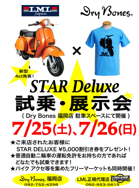 告知を失礼致します! Dry Bonesのスタッフの☆ぷー☆と申します。 http://www.dry-bones.com/ 7/25(土)、26(日) の二日間、Dry Bones福岡店で、 「フリマスペシャル&LML展示会・試乗会」 を開催致します 前回までの様子はコチラ!↓↓↓↓↓↓↓↓ http://mixi.jp/view_album.pl?id=28568670&owner_id=20223138&mode=photo 今回はSTAR Deluxeの試乗は勿論のこと、 フリマ特別編と致しまして、 ヘルメットやバイクパーツの出店も予定されています さらに、 新型4ストロークエンジン搭載のSTAR Deluxeの展示・発表