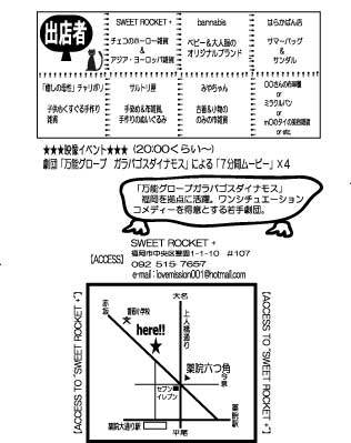 こんにちは。毎日暑いですね。昼間外に出れなくなってきました。。 さて、イベントの告知をさせてください。 7月26日(日)12時くらいから"SWEET ROCKET +"(福岡市中央区警固1-1-10)で "サンディマルシェ(Vo.1) "という雑貨市を行います。 福岡市の雑貨屋さん、アーティストなど7ブース。 メンバーは以下の通り♪ SWEET ROCKET +(チェコ雑貨&アジア・ヨーロッパ雑貨) bannabis(ベビー&大人服のオリジナルブランド) 癒しの母性チャリポリ(子供心くすぐる手作り雑貨) サルトリ屋(手染め服&布雑貨,手作りぬいぐるみ) はらかばん店(サマ