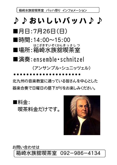 日曜日の午後はensemble・schnitzel(アンサンブル・シュニッツェル)の皆さんによるバッハの合奏演奏です。 シュニッツェルって日本風にいえば「カツレツ」みたいな料理で、ウィーンでは名物料理のひとつです。この名前を付けたグループは一体どんな演奏を繰り広げるのでしょうか?おそらくおいしいでしょう。楽しみです。 演奏は午後2時からです。 喫茶料金のみでOKなので、みなさん気軽にお店へ足をお運びください。