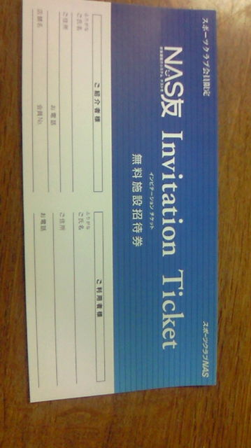 久しぶりにあげますしようと思います 今回はNASスポーツジムの招待券を貰いましたが友達で使う人がいなく、もったいないので 今は二枚ありますが、もしかしたら友達が一枚使うかもしれません その時はお一人様にお譲りします 有効期限今月末なので早めに締め切りたいと思います。 希望される方は、なぜ行きたいかを詳しく書いて頂ければ嬉しいです。 料金は郵貯振り込みで80円になります。 では、よろしくお願いします
