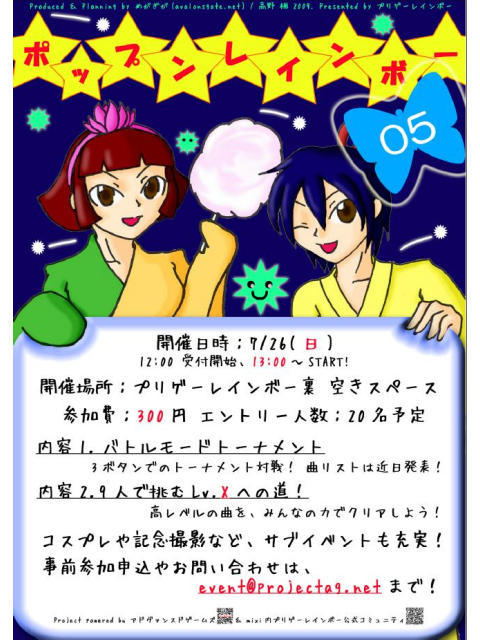 ほぼ定例化してきました、福岡市内で数少ないポップンのイベント、今回もがんがりますよ! 勿論コンセプトは、 「トップランカーばかりが主役ぢゃないよ! 「楽しくプレイする」私達が主役だよ! 太陽がんがんでも、負けないよ!」 (ゲーセン内はクーラーあるけどね(笑)) ●開催日: 2009年7月26日(日)12時受付・13時開始(所要時間:約3〜4時間以内を目処) ※イベントは店舗裏の空きスペースにて開催します。 ●参加費: 300円(当日はおつりのないようにお願いします) ●エントリー人数枠: 最大20人(状況により変動ありま