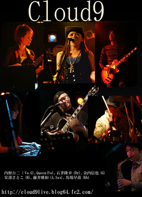 Cloud9 内野公二(vo.g.) Queen(vo.) 石井隆幸(ds.) 金内信也(g.) 安部 さとこ(b.) 馬場早苗(key.) 藤井雅和(sax.) ♪OPENー20:00 STARTー20:30 ♪CHARGE 1,500yen day1,800yen(要オーダー) 先月のLIVEが大好評につき 2ヶ月連続のスペシャルライブ♪ ストロベリーのライブでは 前回よりメンバーとして加わっているボーカルQueen。 うまいを通り越してすごいw 10代でありながら女性としての迫力のある歌声。 クラブシンガーを思うような雰囲気。 カッコイイです! もちろん内野さんのボーカルも渋さ最高( >