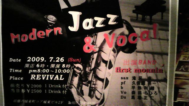 ◎主催Revival ◎前売り券:\2.000- ◎当日券:\2500- (1Drink付き) 《チケット購入は、Revivalまで!》 問い合わせ TEL027-234-4320 First Moanin《JAZZ Live》 (メンバー) Ba.平形利緒 Dr.馬場正仁 P.久保園 英一 Sax.滝沢渉 Vo.森田ちひろ Revival日程 http://music.geocities.jp/yuuei2453/schedule.html