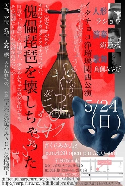 大市(巫女王)が死んだ! それはヤチガラスが敵勢力の策略にまんまと乗せられたせい。 それはスクナビコが自らの作品に没頭し過ぎたせい。 自責ずっしりの二人は相談し、少々やんちゃな巫女を仕立てる。 その制御に作った『呪術琵琶』だったが‥‥ 苦悩、友情、愛情、忠義、鬱、入り乱れての壮大なる邪馬台みうじかる浄瑠璃! 少なビコ(人形)(ラショウ) ヤチ烏(菊乃丞) イヨ(鳥飼みやび) 7/26(日)6:30open 7:00start \1500(1drink) at さくらみかふぇ http://www.kcc.zaq.ne.jp/sakurami/