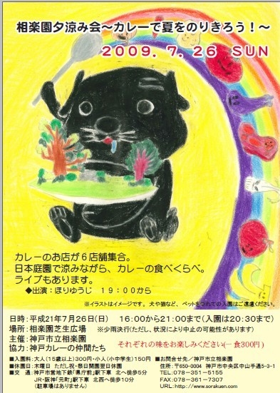 「相楽園夕涼み会〜カレーで夏を乗り切ろう!〜」 神戸のカレー野が6店舗集合! 日本庭園で涼みながら、カレーの食べ比べ。 ライブもあります! 毎日カレー食っているカレーミュージシャン「ほりゆうじ」が19時からライブ! 16時から21時まで(入園は20時30分まで) 場所はなんと神戸1番の日本庭園がある神戸市立相楽園の芝生広場。 小雨決行 でも状況によります。 主催は神戸私立相楽園 入園料:大人(15歳以上)300円小人(小中学生)150円 休園日:木曜日 交通:神戸市営地下鉄「県庁前」駅下車 北へ徒歩5分 駐車場