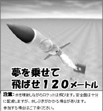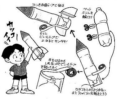 ペットボトル2本でロケットを作り、水と空気圧で飛ばそう! 参加費:400円(当日) 持ってくる物: ?カッタナイフ(ペットボトルを切るので大型)?ハサミ ?ホッチキッス(3号針の大きいもの)?18mm幅セロテープ ?油性マジックペン数本(ロケットに好きな絵を)?15mm幅両面テープ ?帽子?タオル?弁当?飲物 参加資格: 近畿地区の小・中・高生並びに日本宇宙少年団近畿地区団員 小学校3年生以下は必ず保護者同伴でお願いします。 種目:?飛距離競技?定点競技(50m)どちらかを選んで 定員:100人 *雨天順延(