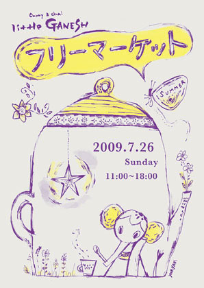 のんびりした異国情緒ただよう 西宮の隠れ家チャイショップ「little GANESH(リトルガネーシュ)」にて フリーマーケットを開催いたします。 店先にブースが並ぶ この青空マーケットで 雑貨やカワイイ古着、ほりだし物のガラクタにも出会えるかも! 店内ではおいしいチャイやカリー、スイーツもお楽しみいただけます。 お気軽に遊びにきてくださいね☆彡 ※雨天の場合は店内に出店いたします。 ■日時:2009年7月26日 日曜日 11:00〜18:00