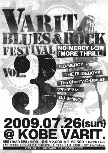 7月26日(日) 神戸 VARIT http://www.varit.jp/index.html 「VARIT.BLUES&ROCK FES.vol.3」 NO-MERCY / THE RUDEBOYS / The Cherry-O-Babies ヤマトアラシ OPEN 18:30 START 19:00 前売 2,000円 当日 2,500円 (drink別途)