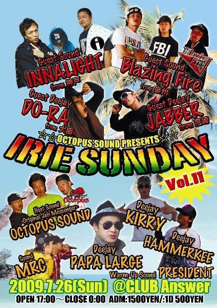 管理人様告知失礼します。 -OCTOPUS SOUND PRESENTS- ★★Irie Sunday vol.11★★ 2009.7.26(SUN) @ANSWER OPEN 17:00 CLOSE 00:00 ADM:1500 ※入場の際に1DRINK頂きます [GUEST SOUND] BLAZING FIRE from泉州 INNALIGHT from神戸 [GUEST DEEJAY] JABBER from尼崎 DO-RA from大阪 [SOUND] OCTOPUS SOUND MRC PRESIDENT [DEEJAY] PAPA LARGE KIRRY HAMMERKEE 今回のGUESTはFROM泉州 BLAZING FIRE!!! 精力的にSOUND CRASHにも参加し 幅広い選曲と気合のこもったMADなDUBで すべ