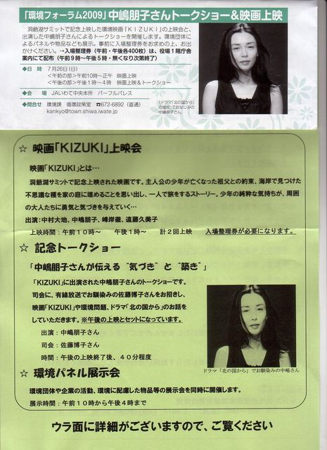 洞爺湖サミットで記念上映した環境映画「KIZUKI」の上映会と、 出演した中嶋朋子さんによるトークショーを開催します。(午後の部のみ) 映画ホームページ:http://www.eigakizuki.com/ 日時:7月26日(日) <午前の部>10:00〜12:00 映画上映 <午後の部> 1:00〜 4:00 映画上映&トークショー 場所:紫波町 JAいわて中央本所 パーフルパレス *入場整理券が必要です。 AM9:00〜PM5:00まで紫波町役場1F庁舎案内にて配布中。 *お問い合わせは 紫波町役場