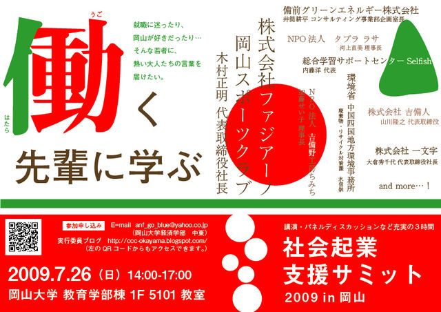 ------------------------------------------------ 社会起業支援サミット2009 in 岡山 〜「社会を変える」を仕事にした地域のヒーロー列伝〜 ファジアーノ岡山木村社長をはじめとして県内で 社会課題の解決に挑む「社会起業家」が一堂に集結! 日時:7月26日(日) 14:00〜17:00 場所:岡山大学 教育学部棟 1F 5101教室 概要:県内の社会起業家による講演 参加費:無料 主催:社会起業支援サミットin岡山実行委員会 協賛:岡山大学生活協同組合 URL:http://www.cccjp.org/event/okayama.php http://ccc-okayama.