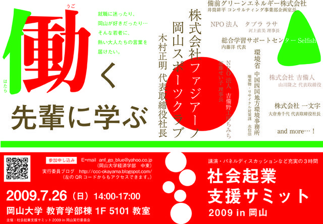 岡山大学2年の別府です。 来る7/26(日)に社会起業支援サミット2009in岡山を開催します。 これを読んでいる方のほとんどは「社会起業…?」と思われるでしょう。 そこでこのイベントを通し、社会起業について知ってもらい そして自分の人生における選択肢を増やしてもらおう!との想いで企画しています。 このようなイベントは岡山では初の試みです。 今回はファジアーノ岡山の木村社長をはじめ 県内に活動拠点をおいて活動しているNPO法人の代表の方などに 「なぜ社会起業の道を選んだのか」 「軌道にのせるためにどのような努力をしてき