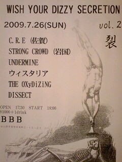7/26(sun)山口 宇部BBB 『WISH YOUR DIZZY SECRETION vol.2 "裂"』 ・C.R.E(佐賀) ・STRONG CROWD(岩国) ・UNDERMINE ・ウィスタリア ・THE OXyDiZiNG ・DISSECT OPEN17:30 START18:00 \1000 +1drink