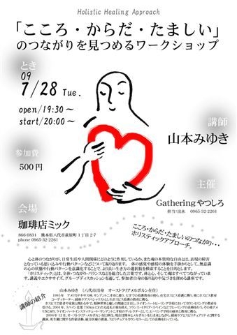 二見@Gatheringやつしろです。 7月28日(火)の夜、山本みゆきさんを八代へお招きし、 「こころ・からだ・たましい」のつながりを見つめるワークショップ を開催します。 じっくりと自分のこころ・からだ・たましいと向かい合うワークショップです。 自分自身を見つめなおす機会として、ぜひご参加ください。 心と体のつながりが日常生活や人間関係にどのように相互作用しているか、また魂の本質自由に 表現するにあたって障害となっている思い込みや行動パターンの根源について振り返ります。 体の感覚や感情の体験をてがかりとし