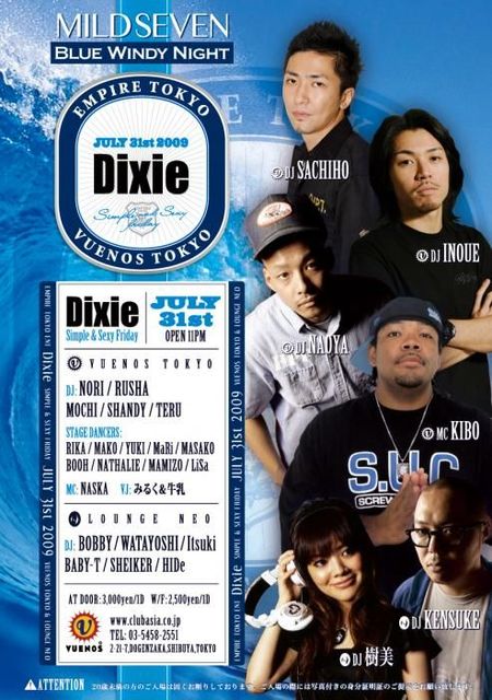 本格的に夏になり、皆さんのテンションが上がる中お送りする記念すべく第一回目は大盛況だったVUENOS、NEO連動DJ ONLY PARTY、DIXIE第二弾は様々なBIGイベントとコラボし反響を経ているMS presents BLUE WINDY NIGHTがDIXIEとタッグを組み前回以上の盛り上がりを約束しますメンツもVUENOS SIDEにはSACHIHO、INOUE、NAOYA、NEO SIDEにはKENSUKE、樹美といった豪華DJメンツ、RIKA、YUKI、MARI、MASAKO、BOOH、MAMIZO、NATHALIE、RISAといった当パーティー名物のステージダンサーもこの日ならではの装いで皆