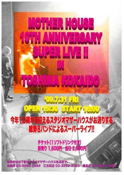 【2009/7/31(金)豊島公会堂】 ☆MOTHER HOUSE☆ 10TH ANNIVERSARY SUPER LIVE ペプシコーラ協賛 OPEN:15:30 START:16:00 1ドリンク付で 前売り 1600円 当日 2000円 FOOMOON:7番目、19:20頃出演予定 その1ドリンクは、やっぱあれ?ペプスィ??プシュッ! 。.:♦♥♦:.。。.:♦♥♦:.。。.:♦♥♦:.。。.:♦♥♦:.。。.:♦♥♦:.。。.:♦♥♦:.。。.: