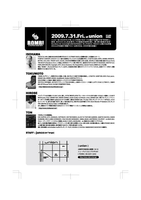 ハッピーなハウスサウンドをエッジの利いたビートに乗せてお届けする「BOMB!」! 前回watusiさんをお招きしての開催が好評を博し、第2弾の開催が決定! Resident DJ4人によるFUNKY&TRIBAL! そしてVOCAL TRACKへと導かれる 至福のひとときを是非ご堪能下さい! 女性の方は2,000yen飲み放題! ■7/31(fri)■ “BOMB!” @ union http://www.club-union.jp/ DJ:ISOHAMA TOKUMOTO HIROSE TON STAFF:junco (en*large) AD:2000yen(w1D) With Flyer:1500yen(w1D)