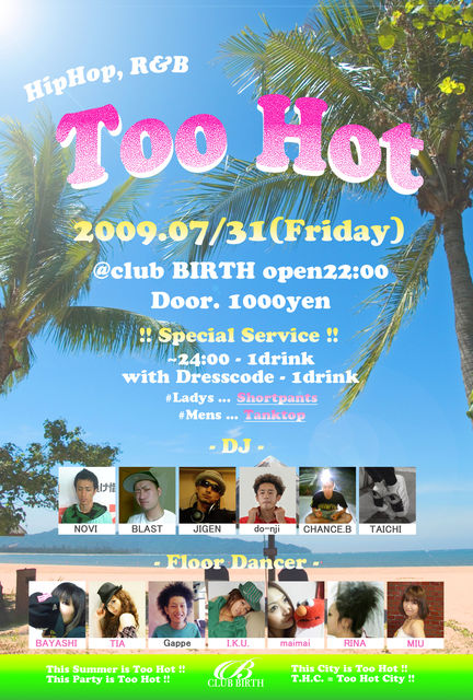 7月31日(金) 『Too Hot』... HipHop - R&B @club BIRTH 豊橋 open22:00 Door.1000\ -SpecialService- 〜24:00.....1Drink with Dresscode.....1Drink (#Ladys...Shortpants) (#Mens...Tanktop) -DJ- NOVI (STREET PLAYER) BLAST (DOLLBACO RECORDS) JIGEN (DA LA Central) do-nji CHANCE.B (MAZE) TAICHI -Floor Dancer- BAYASHI (Wannabe) TIA Gappe I.K.U. (TIMTAM) maimai(TIMTAM) RINA MIU 『Too Hot』は豊橋のHipHopシーンで活躍する若手DJとDancer、