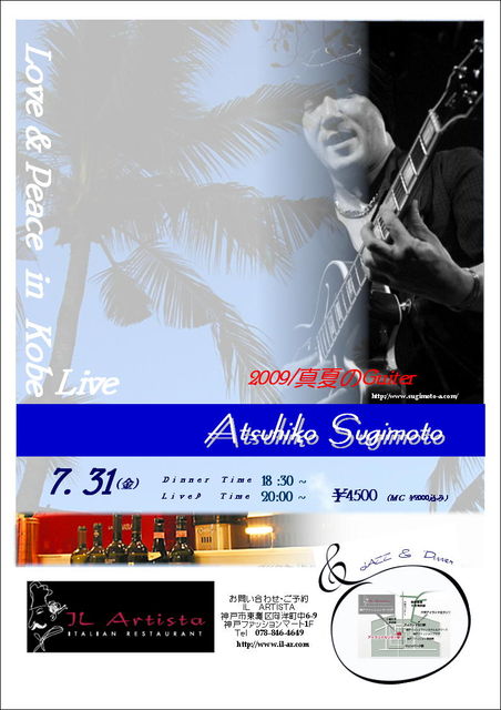 杉本篤彦・真夏のツアー「平和への旅・Love&Peace」 杉本篤彦ソロギターライブ 7/31(金) Il Artista(イル・アルティスタ)〜神戸 六甲アイランド Dinner Time 18:30〜 / Live Start 20:00〜 料金4500円(MC 2000円 + Dinner Set 2500円) info:Il Artista(イル・アルティスタ) 神戸市東灘区向洋町中6-9 神戸ファッションマート1F TEL:078-846-4649 / FAX:078-846-4659 website:http://il-ar.com/