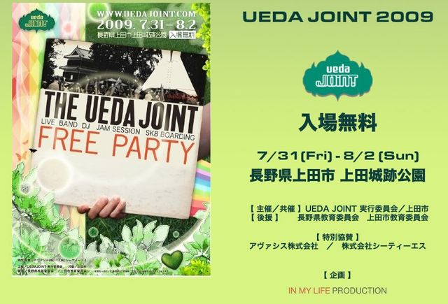 みなさんいよいよですね〜 7/31〜8/2の三日間ですよ〜 予定は空けてますよね〜 準備は良いですか〜 こないと後悔しますよ〜 こんなに豪華でタダですから〜 また今年も上田城で伝説が生まれます 『UEDA JOINT 2009出演予定アーティスト』 BEAT-RICE blissed Bong Jing Chi3 Chee a.k.a. Hikitch (THINK TANK) 地下鉄Crew Cinema DUB Monks Jeffrey Connor(from L.A.) conomark cosmorama Cro-Magnon Cutsigh a.k.a KASAI (AUDIO ACTIVE) DIZZY VENTILATORS (from N.Y.) Dragon 76 Drift Wood DUBLUES Band