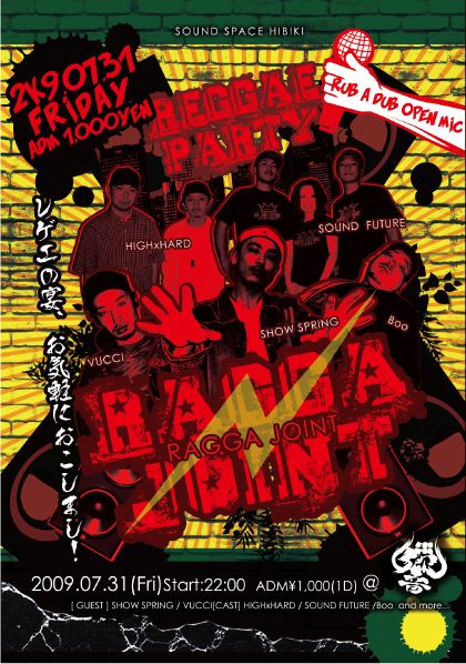 ※告知失礼致します※ 夜はコレからというJOINTフリーク、レゲエを愛する皆様he。 22:00からリニューアル改装した元Club SEASON改め[SOUND SPACE響]!!! REGGAEな夜がお得な¥1,000(1D)でやりますよ〜 しかも1Fと2Fが分かれてるんで2フロアだから遊びやすいですよ、、 みなさん31日上田JOINTの後はREGGAEな夜でお待ちしております。 以下イベント詳細です!! ------------------------------------------ 2009.07.31(Fri)@ SOUD SPACE 響 OPEN/ 22:00 ADM/ \1,000(1D) 響の場所は↓コチラ↓から!!