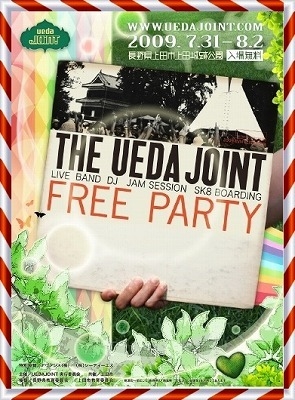 2009年7月31〜8月2日 『UEDA JOINT』 in 長野県・上田城跡公園内 入場無料 雨天決行 http://www.uedajoint.com/ ナント嬉しいフリーパーティ!! 今回は、北アフリカの楽器で「ウドゥ」(陶器)を作ってる方と出店します。 お楽しみに◎