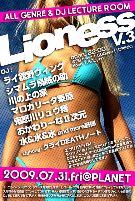 飛んで火にいる夏のCORE! 宇都宮RAVEシーン革命の日と言われる、来たる8/15のHappinessを目前に 「フジロックに前夜祭があるんだから、Happinessにもあっていいだろう」 と言うHappiness crewの意向により前夜祭が急遽実現しました!!! しかもパーティーはお馴染み『LIONESS』!! そう!ラウンジでは飛び入りDJ OK! 今年最大のDANCE MUSICの祭りは前夜祭から楽しもう!!! /////////////////////////////////////////////////////////////////////////// L I O N E S S v . 3 〜 H a p p i