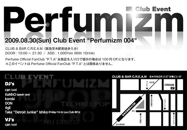 我らがあ〜ちゃん、かしゆか、のっちが日本全国を駆け巡る"Perfume Second Tour 2009 「直角二等辺三角形TOUR」"の真っ只中に、おらがホームのCLUB & BAR C.R.E.A.MにてPerfumizm 004の開催をいたします。