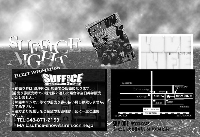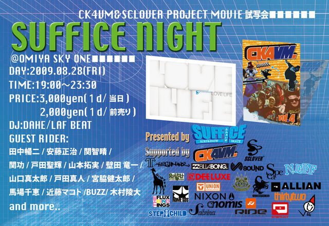 みなさんお待たせしました、 サファイスの代名詞 さいたまのスノーボーダーが一番アツくなるイベント 【SUFFICE NIGHT】 今年も 開催が決定 & 前売り券の発売が開始しました。 今年も SCLOVER PROJECT『LOVE LIFE』 http://www.sclover3.com/ & CK4VM『VOL.4』 http://ck4vm.com/ の新作DVDの試写会あり。 出演豪華ライダー陣のトークあり。 K-LAW&MA$AKIのMCあり? DJのアツいMIXありの 盛りだくさんの内容。 毎年、前売り券でイベントチケットが完売してしまう この内容が濃