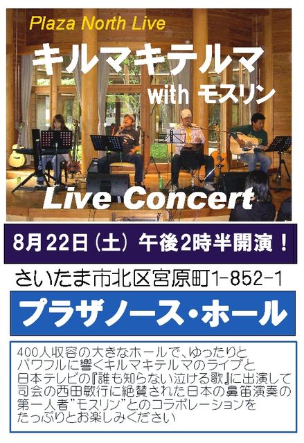 さあて。 前回のIKEAストアライブから、若干日が空いて しまいましたが、次回ライブが決定しましたので イベントトピ立てますよ〜。 ■日時: 8月22日(土)14:30〜 ■場所: さいたま市北区宮原町1-852-1 プラザノース・ホール http://www.plazanorth.jp/ ■出演: マッキーソロ,モスリン,キルマキテルマ ■入場料金: 無料 キルザキ&マーチンで『あの』夏曲も歌っちゃいますよ。 乞うご期待!!