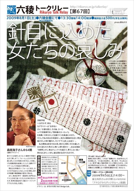 今年も暑い8月がやってきます。 15日が終戦記念日であることは、知識のうえでは知っていても… 実感をもって迎える人は、年々、数少なくなっています。 ことさらに「戦争の記憶」を蒸し返すことが本意ではありませんが、 永らく平和な時代を謳歌したハズのわたしたちは、いま、却って、 「いのちの大切さ」を忘れているような気がしてなりません。 そんな残忍な事件が、毎日のように報道されています。 8月のトークリレーでは、 ご自身も幼少期に千人針を刺した体験をお持ちの森南海子さん(64期)に、 改めて「千人針」の意味を検証してい