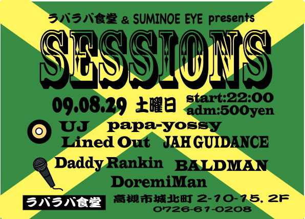今月のSESSIONSも近づいてきました!! ベテラン&ユースのリンクイベント!! 是非、参加してくださいね。 2009 / 08 / 29 / Sat start : 22:00〜 adm : 500円 Sound : UJ / papa-yossy / Lined Out / Jah Guidance dee-jay : Daddy Rankin / BALD MAN / Doremiman info : 0726 - 61 - 0208