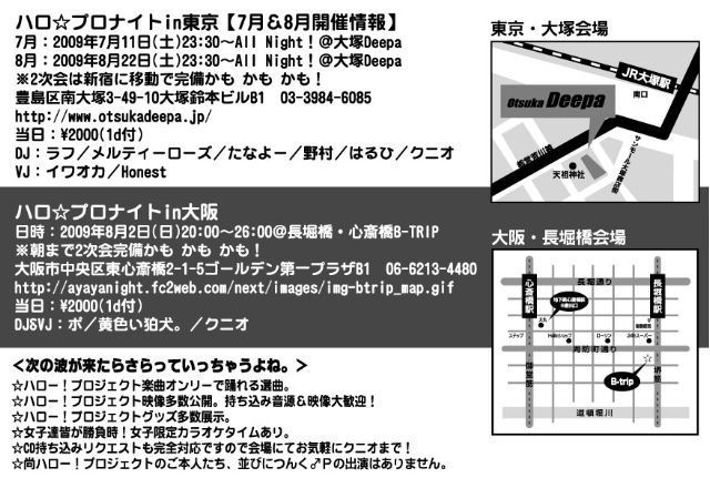 お世話になっております。 2009年夏の“ハロ☆プロナイトin大阪”は、 Hello!Project 2009 SUMMER 革命元年〜Hello!チャンプル〜 終了後、ここから特別な領域をご用意です。 いつものハッピーさに加えなつ、ギラ、来い!で、 今回も楽しくパワフルに盛り上げて行きたいと思っておりますよ。 お時間ご都合よろしければ是非ともご一緒しましょう! “ハロプロナイトin大阪” 日時:8/2(日)20:00〜26:00! ※朝まで2次会完備! 会場:心斎橋B-Trip 06-6213-4480 住所:大阪市中央区東心斎橋2-1-5ゴールデン第一プラザB1 htt