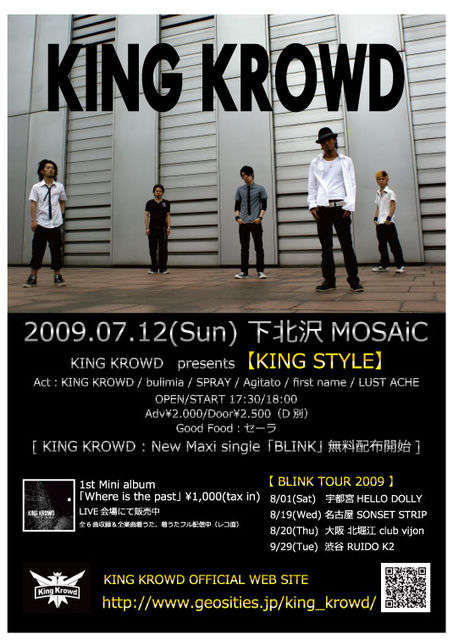※対バン・時間等に若干の変更がありました。 久しぶりの名阪ツアーでっす!! ・2009/08/19(Wed)名古屋SONSET STRIP 『Let's Spend The Night!!』 act:KING KROWD/放課後呼出隊(和歌山)/THE ROBBERS(東京)/SounDriveR/NoiZe-Chap/匠キング open 18:00 / start 18:30 adv\1,500 / door\2.000 KINGKROWD出演は20:50〜予定 ・2009/08/20(Thr)北堀江club vijon 『around a garden』 act:KING KROWD/Freedom/Behind Silver/夕凪GRACE(福岡)/noman rain open 18:00 / start 18:40 adv\1,500 / door\2.000 KINGKROWD出演は20:40〜予定