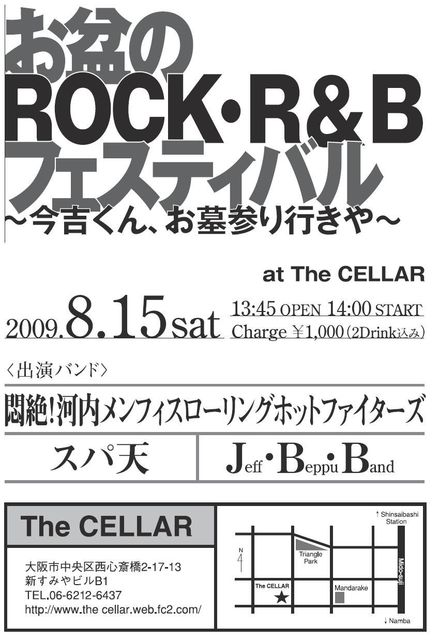 2009年7月3日昼過ぎ現在 ちと今忙しいから後で詳しく書くわあ〜 2009年7月3日17時現在 『お盆のROCK・R&Bフェスティバル〜●吉くん、お墓参り行きや〜』 というタイトルで決定! 2009年7月4日2時30分現在 <出演バンド> スパ天 Jeff Beppu Band 悶絶!河内メンフィスローリングホットファイターズ 13:45open 14:00start charge 千円ポッキリ なんと!2ドリンクス込み!!!(ええええええええ!マジ!?安っ!)