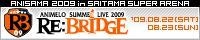 タイトル Animelo Summer Live 2009 -RE:BRIDGE- 日時 2009年8月22日(土)、8月23日(日) 各日 14:00開場、16:00開演 会場 さいたまスーパーアリーナ 出演 8月22日(土) 彩音、 ALI PROJECT、 石川智晶、 いとうかなこ、 ELISA、 栗林みな実、 JAM Project(影山ヒロノブ、遠藤正明、きただにひろし、奥井雅美、福山芳樹)、 茅原実里、 桃井はるこ 他(50音順) 8月23日(日) 奥井雅美、 サイキックラバー、 榊原ゆい、 savage genius、 Suara、 平野綾、 FictionJunction、 水樹奈々、 米倉千尋 、★田村ゆかり★ 他 http://a