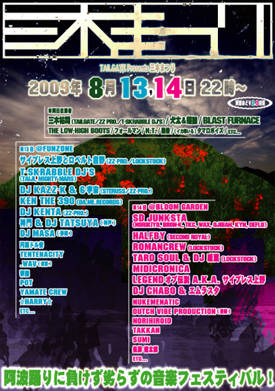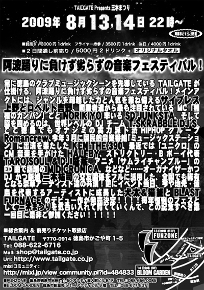 初徳島!!! MIDICRONICAは14日参戦しまーす!! ---------- 〜TAILGATE Presents〜 三木まつり ---------- 開催日時 / 2009年 8月13,14日 (阿波踊り2,3日目) 22時スタート 13日会場 / FUNZONE 住所・電話番号 / 徳島県徳島市秋田町1-50アクティ異人館ビルB1F 088-656-0085 14日会場 / BLOOM GARDEN 住所・電話番号 / 徳島市紺屋町5-1-4アクティビル9F 088-677-8371 ---------- 前売り / 3000円 1ドリンク フライヤー持参 / 3500円 1ドリンク 当日 / 4000円 1ドリンク 2日間通し前売り / 5000円 2ドリンク+タオル --------
