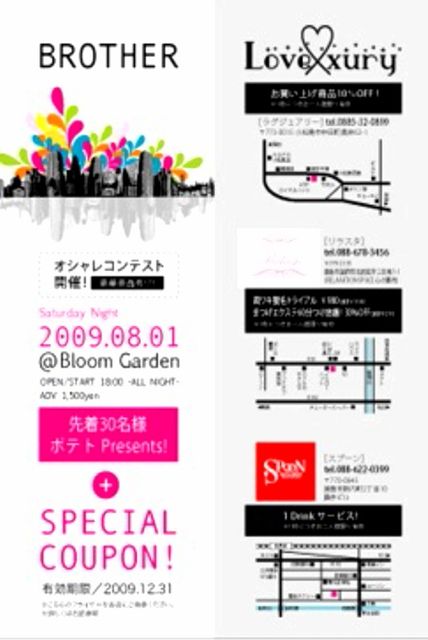 真夏の祭典阿波踊り目前。 2009年8月1日、アクティ21 9階 夜の街のシンボルを陣取る。 大人になりきれない大人たちが開催する文化祭! あのときの興奮をもう一度! ライブ、ダンス、おしゃれコンテストなどなど、誰しもが熱くなれる内容! 酒飲んだり、ライブで首振りまくったり、音にまかせて踊りあかしてみたり、おねーちゃん口説いてみたり(笑) 年齢なんて関係なく遊んじゃいましょう ○おしゃれコンテストでは協賛店からの豪華景品あり! ↓↓↓↓↓↓ 【協賛店】 ■Lovexury 流行のLadysFashionShop 小