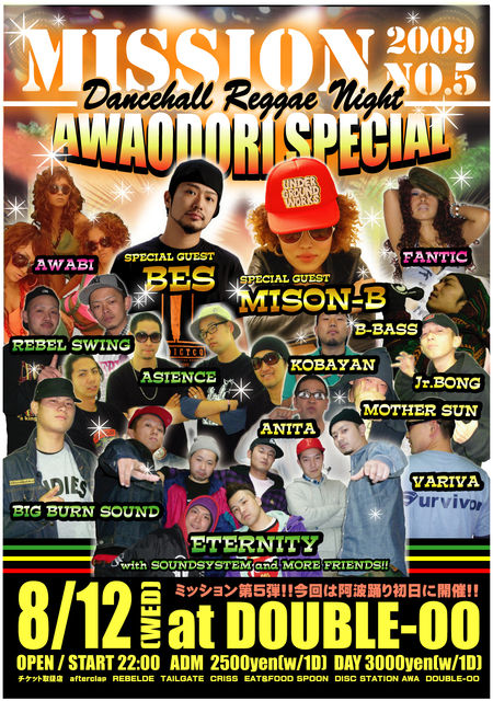 管理人様、告知失礼します。 不適切でしたら削除お願いします。 ★阿波踊りレゲエイベント★ ★☆★☆★★☆★☆★★☆★☆★★☆★☆★★☆★☆★ 当日入場の際、キャッシャーにて『エタニティ』と いって頂ければ前売り料金で入場できます!! ★☆★☆★★☆★☆★★☆★☆★★☆★☆★★☆★☆★ 8月12日(水)阿波踊り初日にDOUBLE-OOにて開催決定!! スペシャルゲストは大阪からBES、MISON-B!! 全国各地の現場を賑わせている二人だけに要注目!! その他、香川、岡山からエンターテイナーが続々登場!!